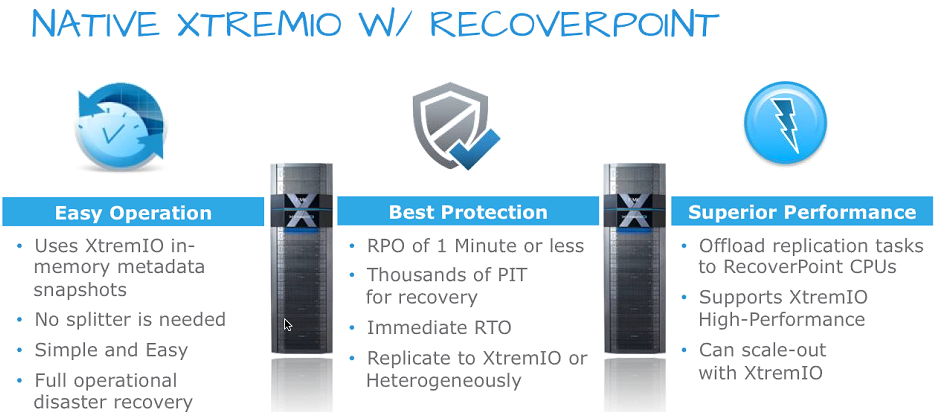 In terms of Remote Replication with 4.0, Native remote replication is implemented with RecoverPoint Asyschronous replication with a unique snap based solution without the need for any RecoverPoint (array-based) splitter. The XtremIO snap based solutions implemented a SCSI DIFF api for RecoverPoint to issue the instruction to ensure to only take/replicate differential snaps across to target Site (after initial full sync for first snapshot). Coupling this with RecoverPoint’s write-folding, deduplication and compression capabilities means a significant reduction in bandwidth consumption. The current implementation is asynchronous with RTO of <60 seconds. The EMC vLAB demonstrating this technology integration is now available as well so reach out if you want to get hooked up with a demo. For those not aware what EMC vLab is and how it works I will post something on that soon for awareness.